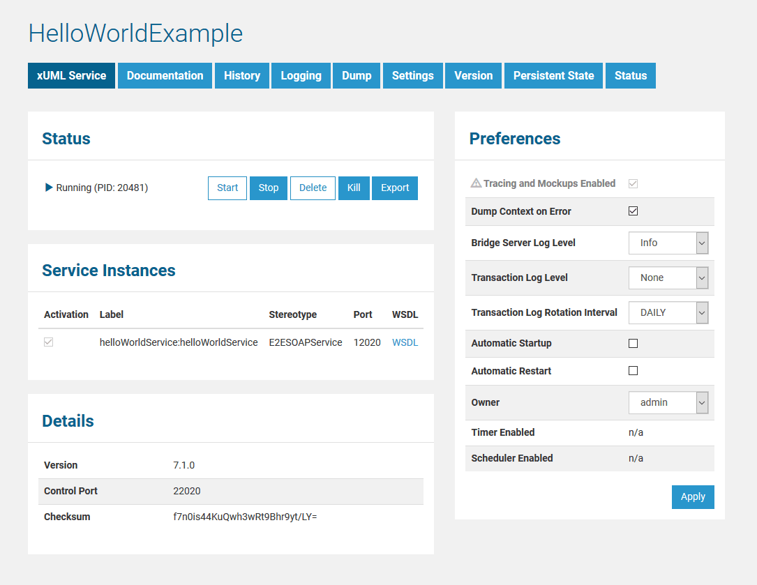 | Tracing and Mockups Enabled | Switching tracing and mockups on / off. All xUML services are compiled with tracing and mockups enabled. This option allows you to turn off the tracing, so that no trace information is returned by the Bridge when a service is called. To change this preference, you have to stop the service - it cannot be changed on a running service. Runtime 2017.8 If you change the flag during runtime, you will get an error "Failed to update the running xUML service". In the service log you will see the following: