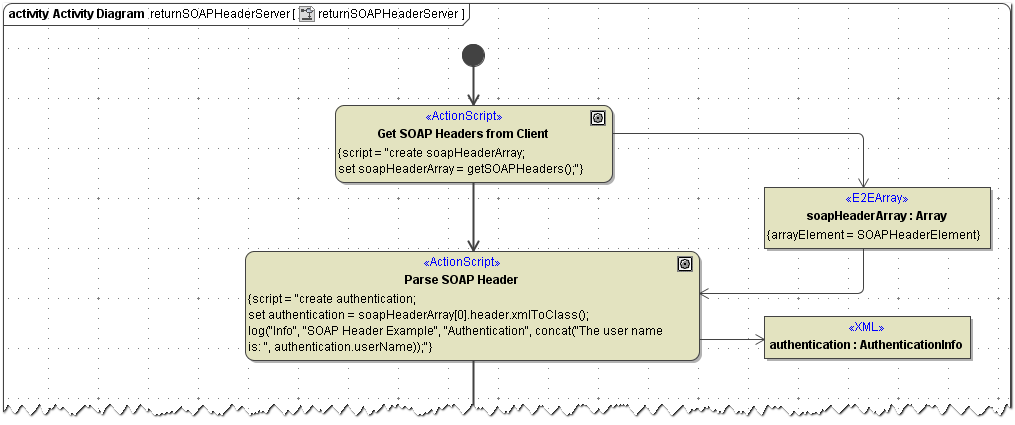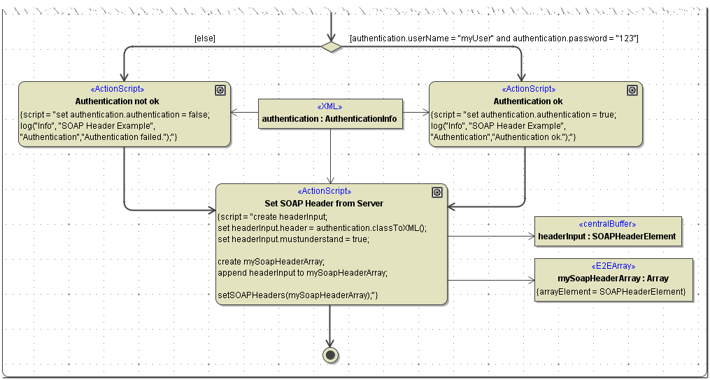 The E2E Bridge is capable of creating custom SOAP headers elements with a build-in function setSOAPHeaders(). The function is called within the service context and needs an array of SOAPHeaderElement objects as an input. The following example shows how to create a simple SOAP header block and set it to the services context.