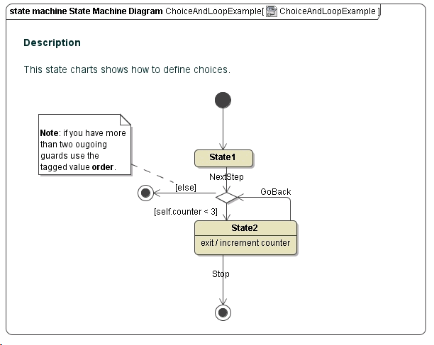 choice (pseudo state)Choice is a pseudo state. When a transition enters a choice element, guards will be evaluated and the matching outgoing transition will be executed.