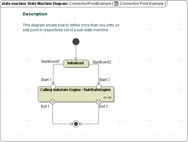 Using entry point and exit point pseudo states, the modeler can define different points through which a composite state can be entered or left. A composite state can have multiple entry and exit points.