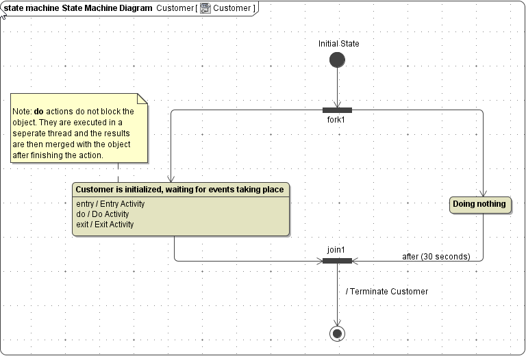 Unlike entry and exit behavior executed within transition contexts, multiple do activities of the same object (when the object is in multiple states e.g. after a fork) can be processed concurrently. This, in conjunction with parallel execution paths (see chapters Fork and Join for an example), can be used to execute multiple long-running activities at the same time.