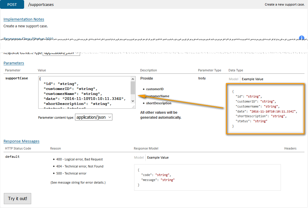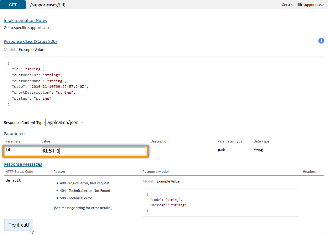 The request comes back with HTTP response code 400. The response body does not contain a support case object but an error object stating "Bad request: customerID is missing.". For more information on implementing REST error handling see Error Handling.