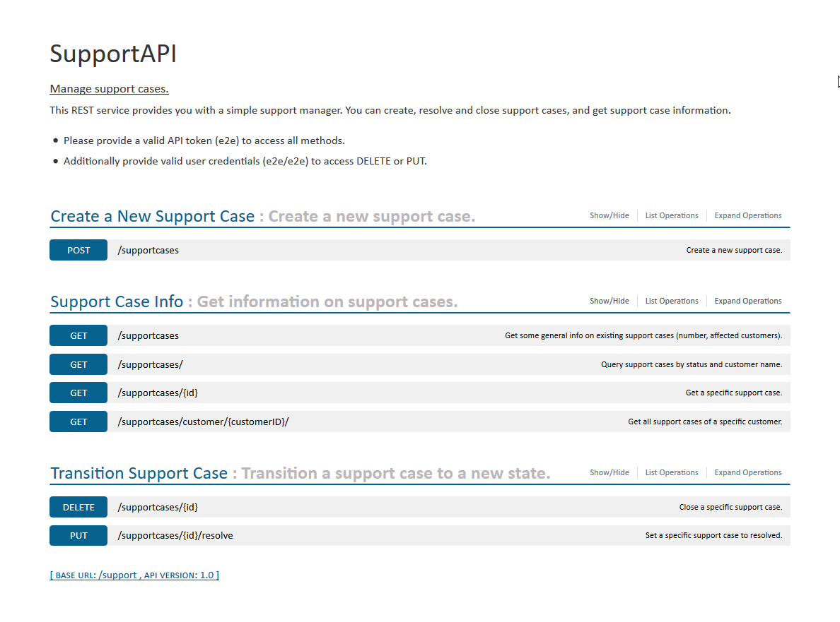 - Click the port type (e.g. SupportAPI in the figure above) to access the REST service documentation page.