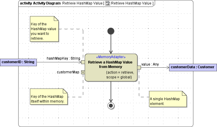 The Memory Adapter allows to store an entire hash map to memory. The hash map object as a whole can be managed with the Memory adapter the same way as any other objects. Additionally, the Memory adapter allows to add, change, retrieve, and remove elements from a stored hash map. Therefore, the Memory adapter provides an additional parameter hashMapKey. If this parameter is provided, the Memory adapter does not access the entire map, but tries to access the specified element of the map.