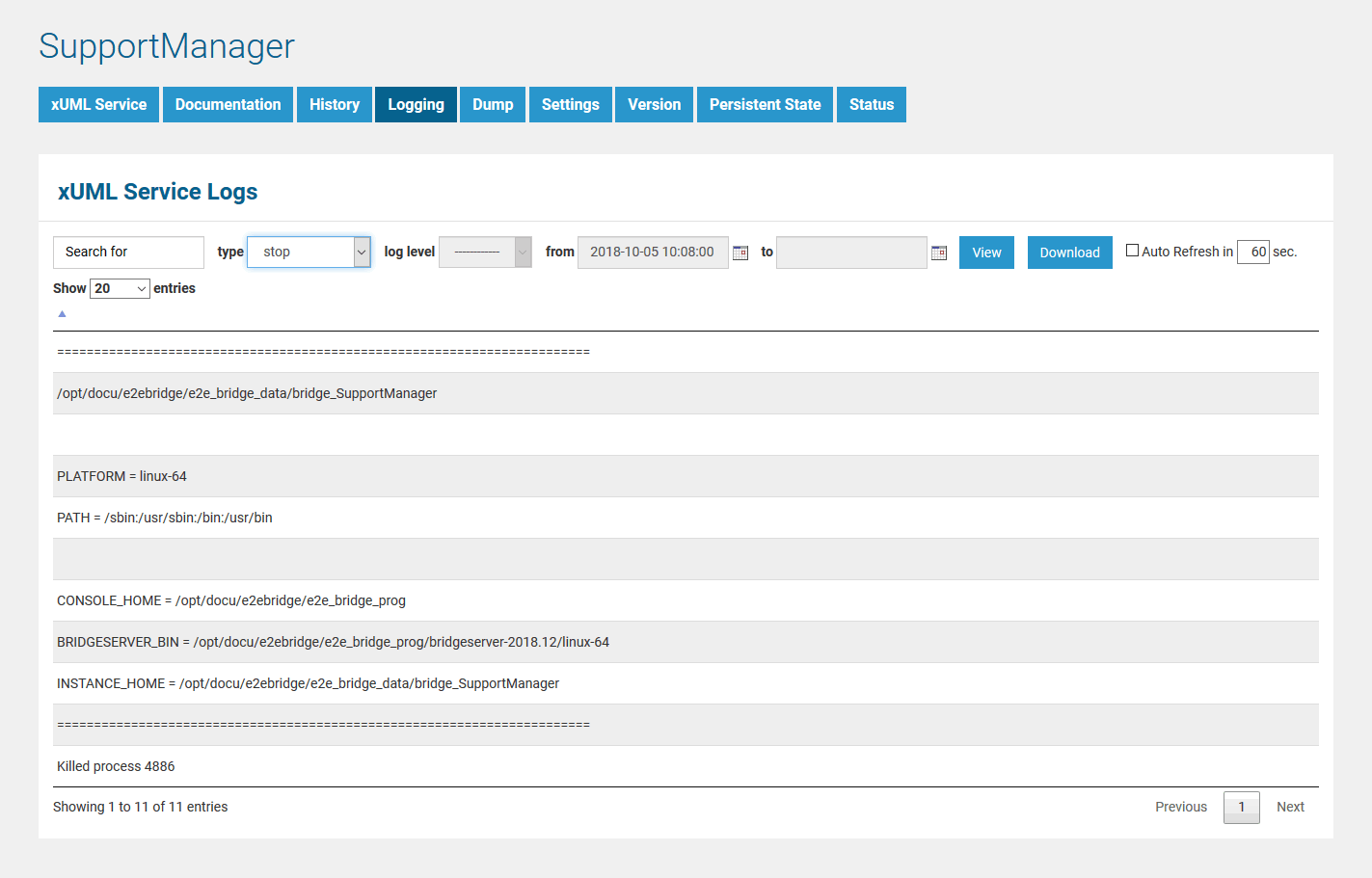 Select stop from the Type dropdown list. Selecting a date has no effect, as the stop log will be overwritten each time the xUML service is stopped.