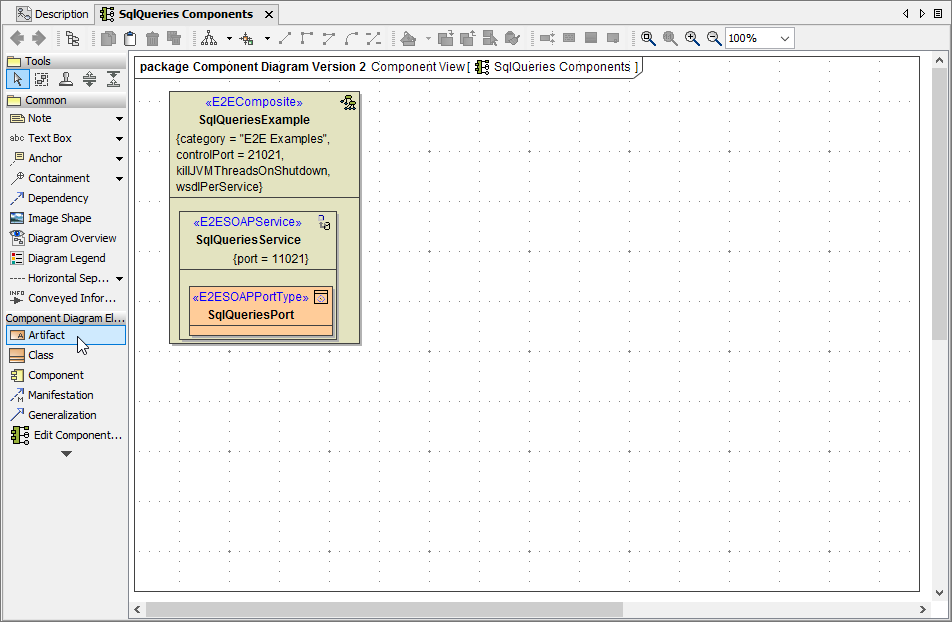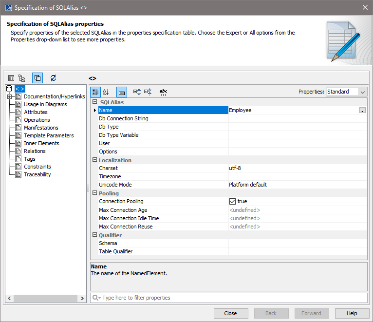 ![]() | Finally, you need to connect the <<E2EComposite>> with the <<SQLAlias>> . Select the dependency icon from the diagram toolbar and draw a dependency from the composite to the alias. |