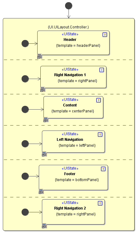 xUML UI offers the possibility to create a complex layout structure by using orthogonal states having different templates assigned to the <<UIStates>>. The layout is defined in regions which can be defined in the <<UIRegion>>.