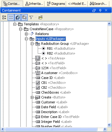 When designing pages purely with CSS, a container for page elements is needed. This is done by using <div> tags. Choosing this approach allows full control of the layout and look and feel leaving HTML table grids away. To be able to create more complex layouts the <div> tags need to be nested. xUML UI supports this way of designing, by generating container tags for each container element (Frame, Panel, ScrollPane etc.) which is modeled in the Magic Draw Interface Modeling Diagram.
