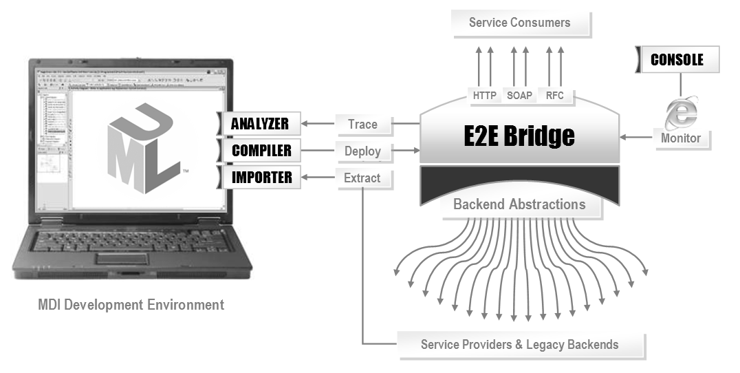 The figure below shows the high-level architecture of the Bridge platform. It consists of the xUML Runtime and its add-ons. An add-on is any component loadable and manageable by the runtime environment. The two most important add-on types are frontend services and backend adapters. The frontend services communicate with client applications using various protocols such as SOAP, SAP RFC, or HTTP(S). The backend adapters enable the Bridge to access various databases, legacy systems, and of course other Web Services. The xUML Runtime also manages base functionality like processing control flows, handling events, or executing action scripts.