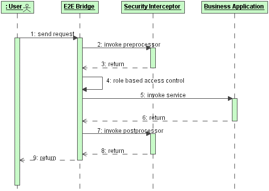 When a user sends a request to the E2E Bridge (1), the bridge invokes a preprocessor, passing it the input message, the Principal and the name of the operation to be called (2). The preprocessor returns the, optionally modified, input message and Principal or throws an exception if e.g. access to the service is denied (3). After the Principals role is verified against the required roles (4), the actual service is invoked (5). The business logic is executed and returns its result (6) which then is passed to a postprocessor (7). The returned output message, again optionally modified (8), is then passed back to the user (9).