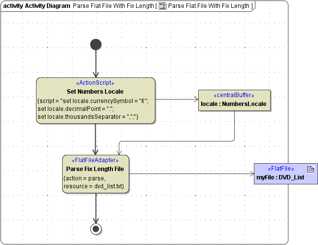 After having defined the structure of the flat file, you can parse such file by invoking a <<FlatFileAdapter>> action as shown in the example below.