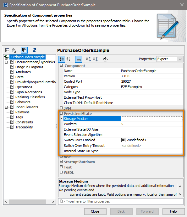 In the specification dialog of the xUML service composite, you can configure the persistent state engine.