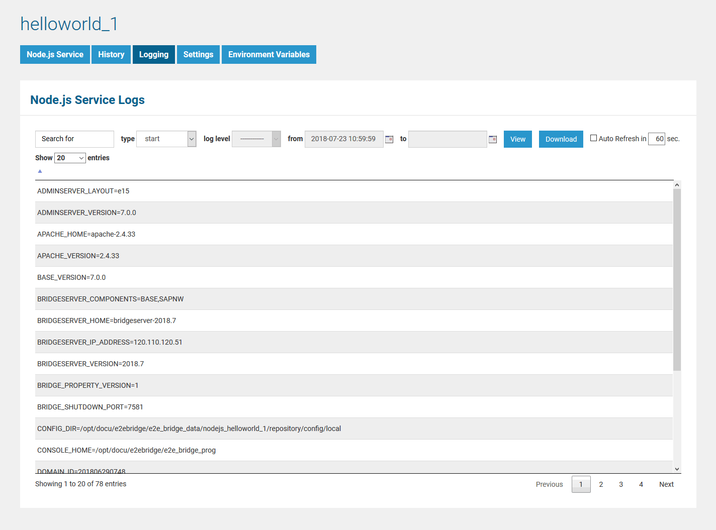 | Service Log | stdout | Contains messages that have been written by the Node.js service to stdout. | ||||||||||||||||||||