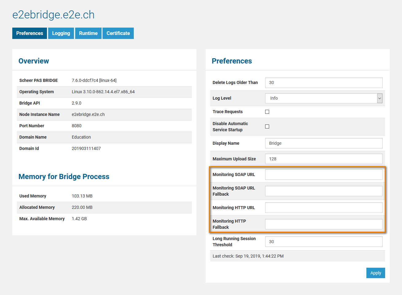 Actually, it is even possible that the monitoring service fails. Thus, a fallback monitoring service can optionally be specified in field Monitoring SOAP URL Fallback. This fallback service can even run on another Bridge.