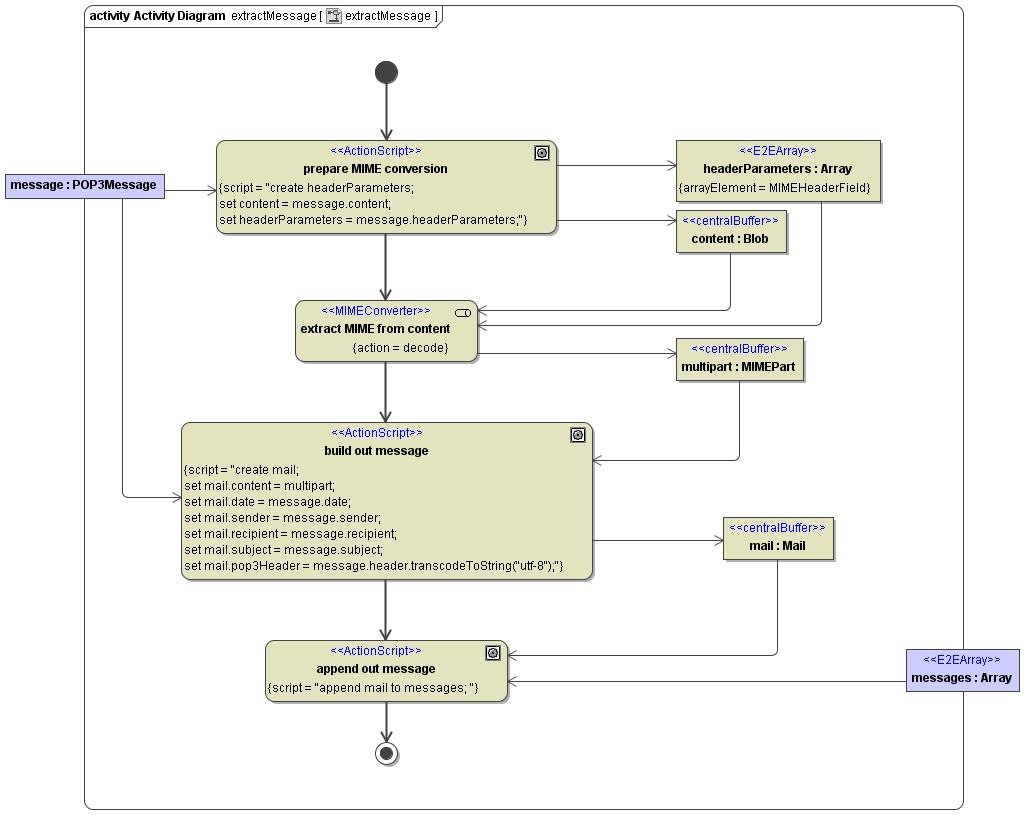 Output of a POP3 Adapter call is parameter message, an object of type POP3Message. The whole content of the message is stored as a Blob in attribute content (see POP3 Adapter Parameter Types). Hence, the content must be decoded and separated into parts to make it readable. This is done by a MIMEConverter in sub activity extractMessage (for more details refer to MIME Converter).