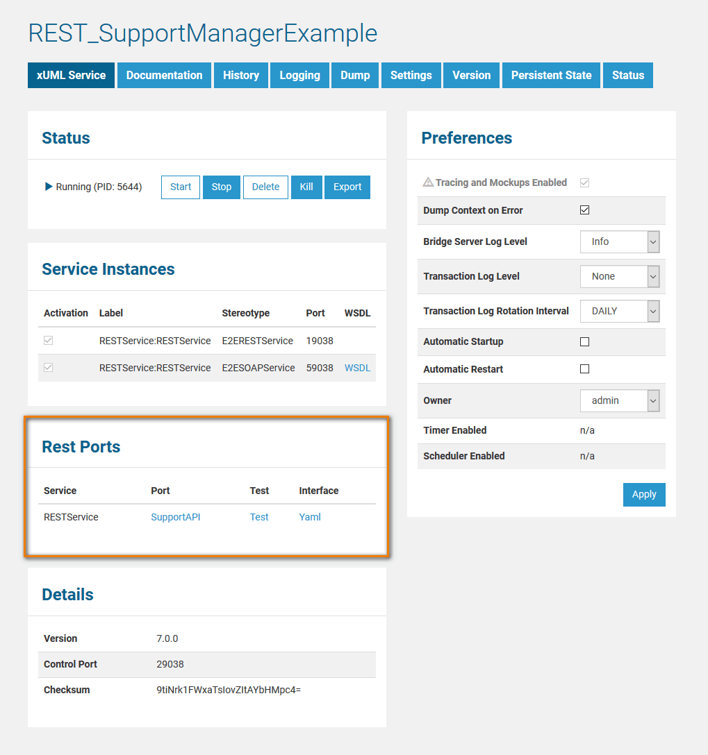 In section Rest Ports, you find a list of all REST service components and their port types. You can do the following here: