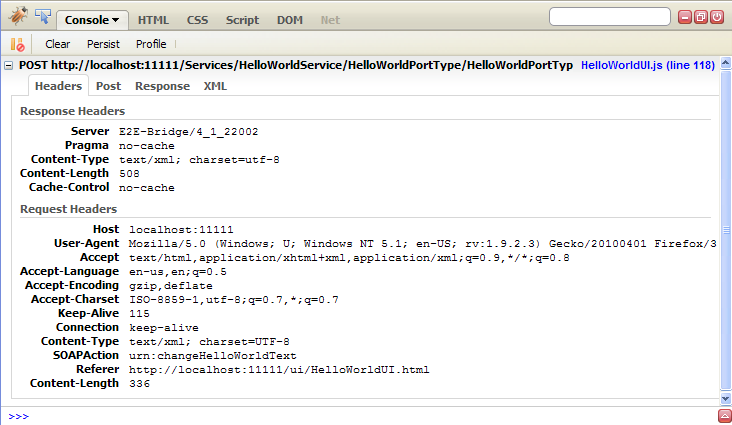 The entry within the console represents the AJAX request the xUML UI sent to the E2E SOAP service. The first tab Headers explains some technical HTTP request parameters that were used for doing this HTTP POST request.