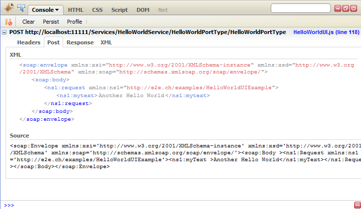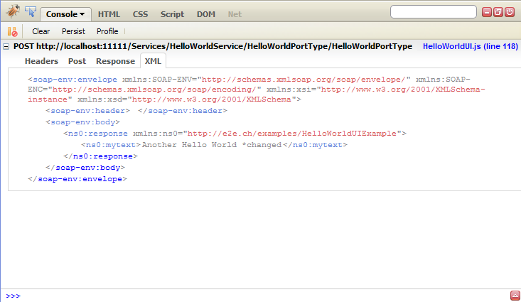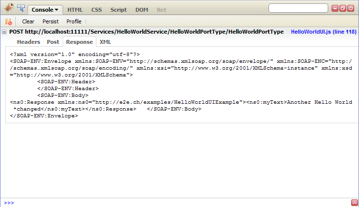 The third tab Response shows the content of the response object. It is the same text from the text input field but now, changed by through the SOAP service has the additional text *changed appended to it. This XML response is used by the AJAX and jQuery framework to change the HelloWorld label field.