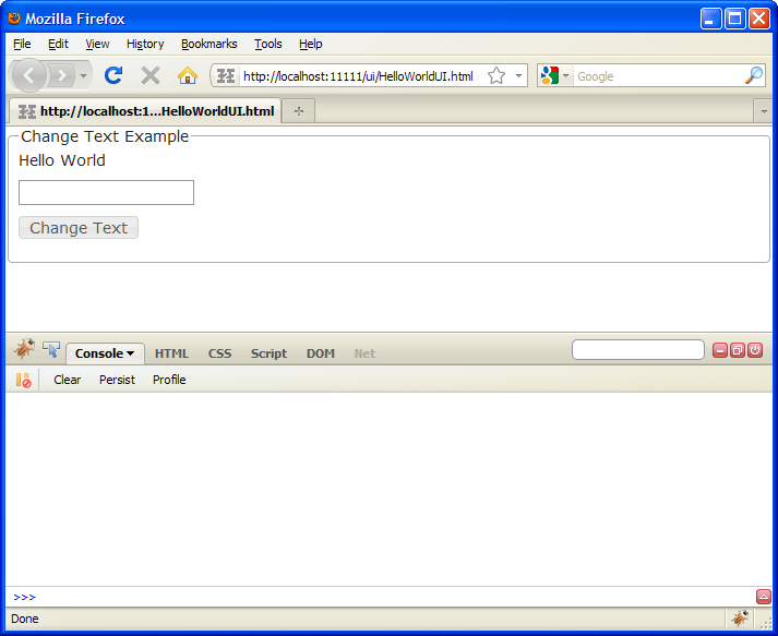 See below the HelloWorldUI example in Firefox with the debug window open at the bottom.