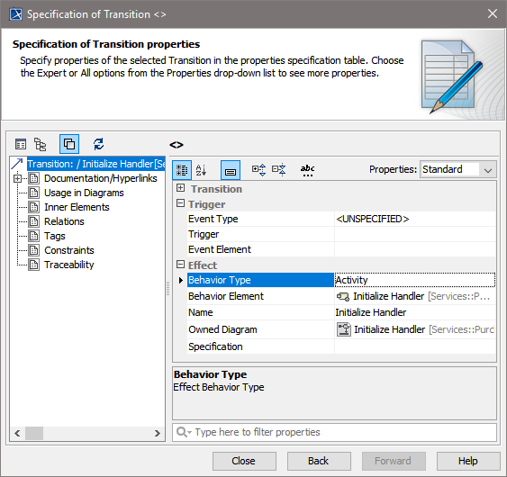 The Effect compartment of the transition specification defines which activity is used to handle a signal. However, it is allowed to define transitions not having any signal handler. Such transitions just change the state of the object and do not have a signal handler. If a signal handler is given, it is defined as depicted in figure Defining the Effect of Creating a Persistent State Object in MagicDraw.