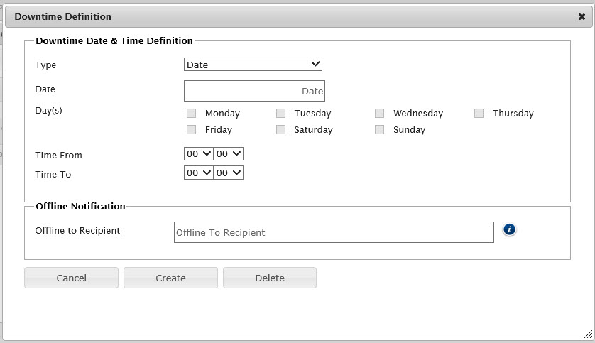 Clicking Create New Entry will open the dialog to create a new downtime entry.