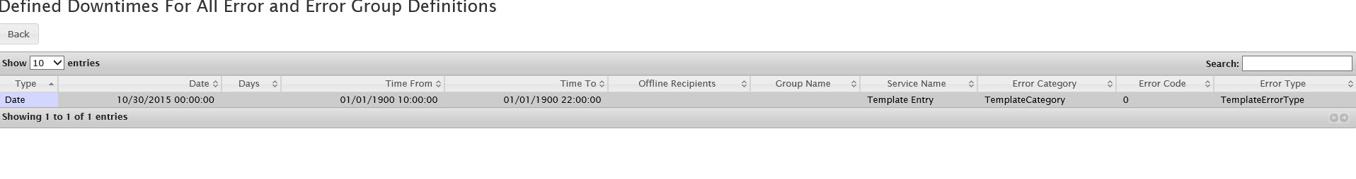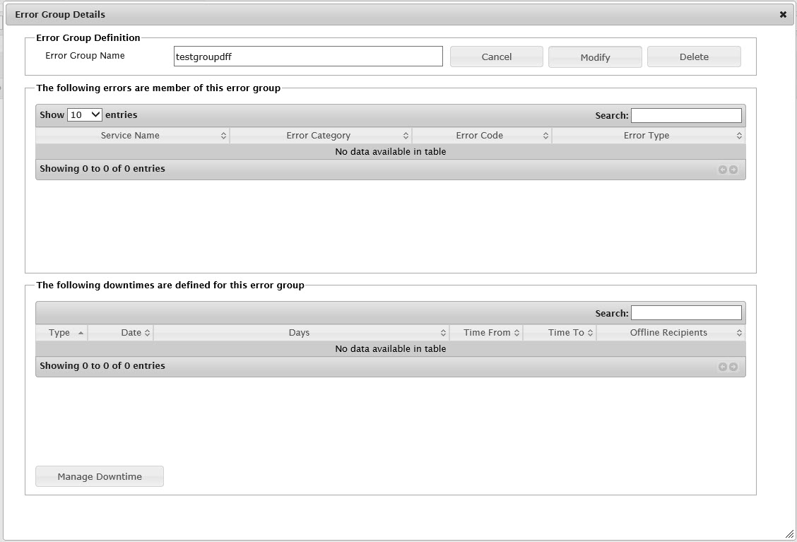 Click Manage Downtime to change the service downtimes for this error group during which occurring errors should not be notified. Refer to Downtimes for more details.
