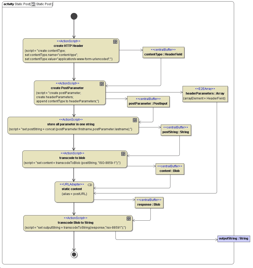 To define a POST request we have the same structure and stereotypes as previously described for the GET request. There are basically two differences. The protocol defined in the component diagram has to be "POST" and the post parameters have to be defined in the activity diagram. In some cases the HTTP-Header has to be adjusted, otherwise the Bridge defaults are used.