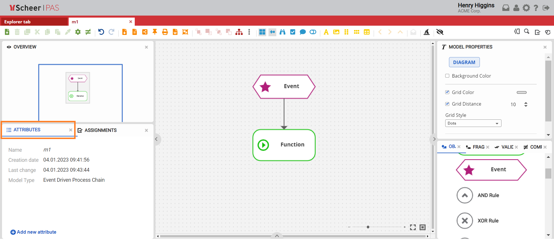 You can drag & drop attributes of an object or model onto the canvas. When an attribute is dragged & dropped on the canvas area, the Attributes section is included in the Model-Object properties section where you can change the attribute properties.