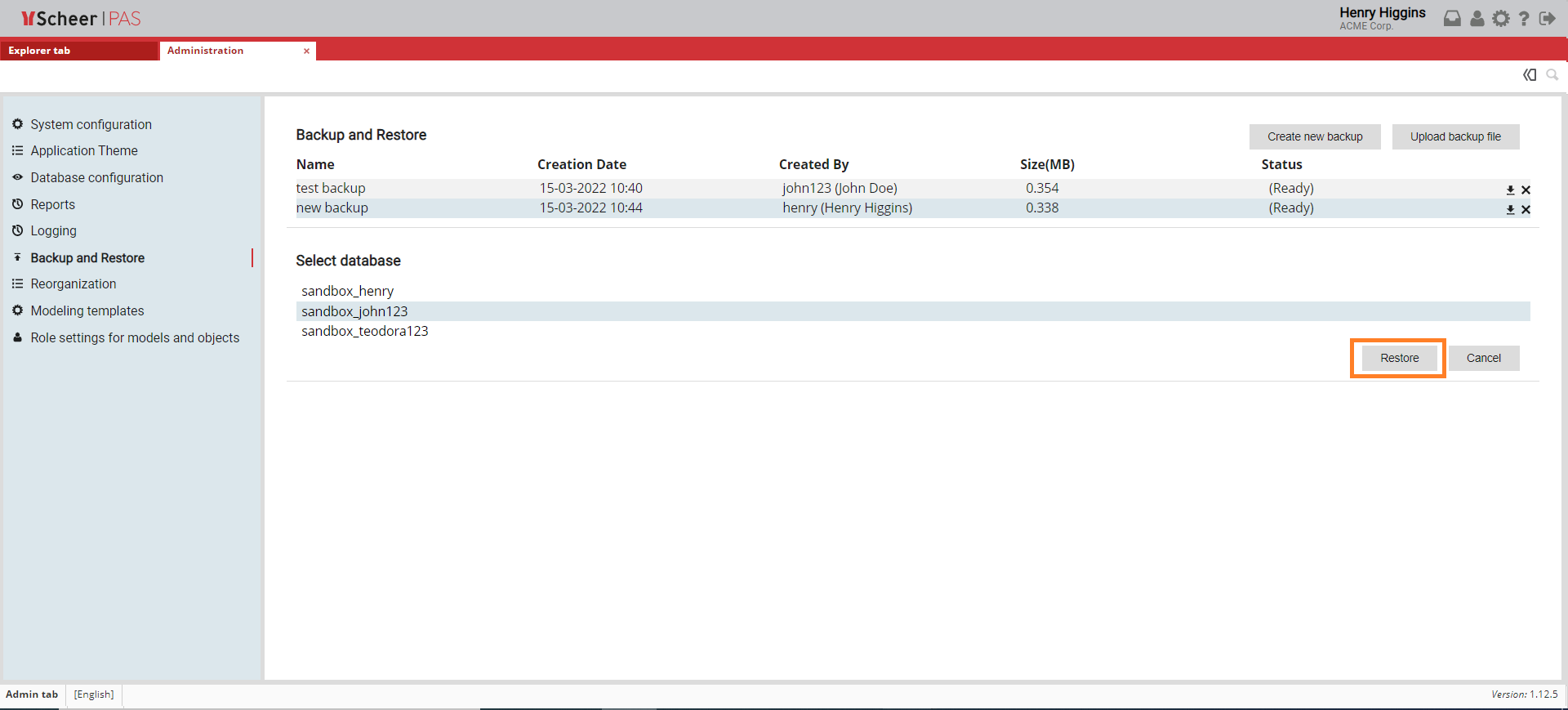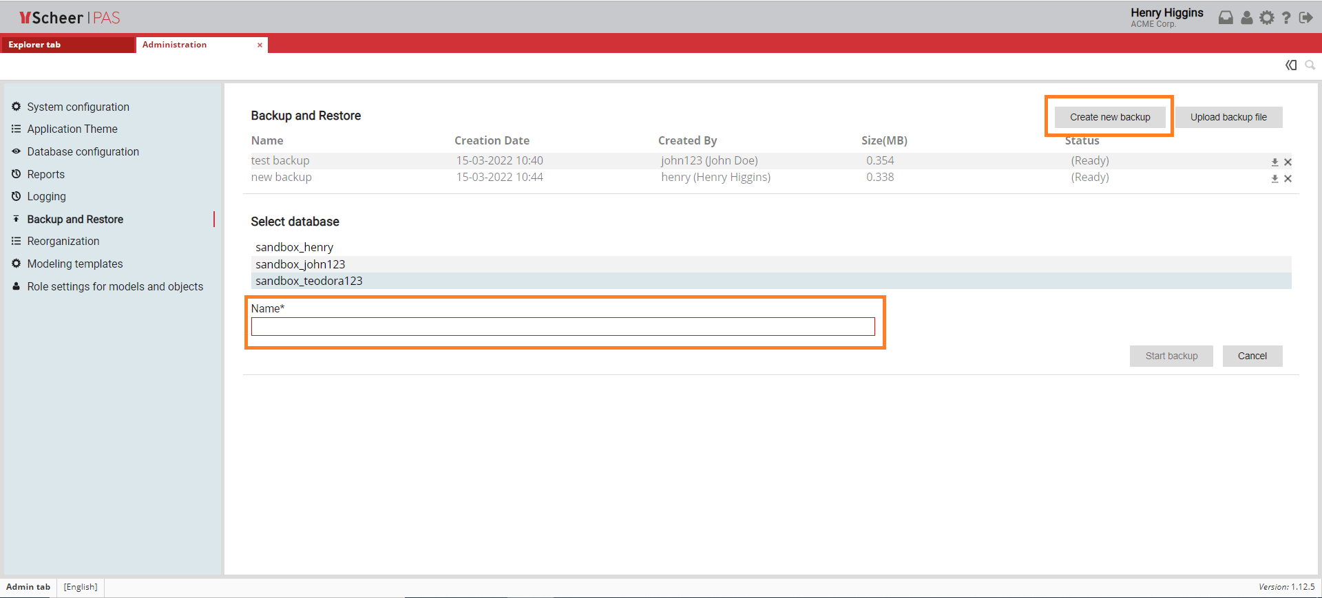 Create a backup of a database by clicking the Create new backup button in the upper right corner. Select the database you want to back up. You can only select databases for which you have permission. Enter the name of the backup in the respective field. Start the backup by clicking the Start backup button.