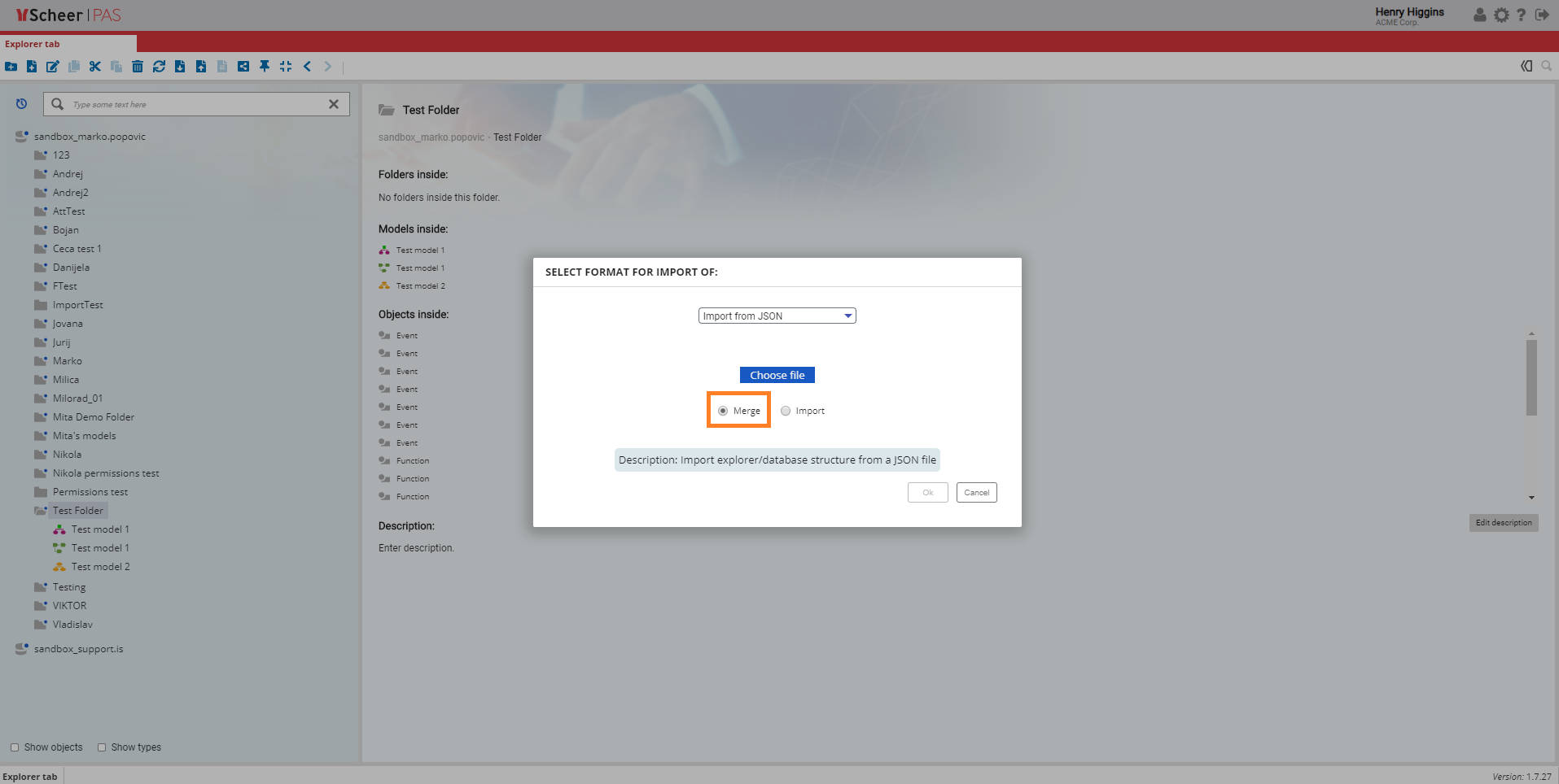 Merge is used when information and models already exist in the target database and need to be updated. This is often used when models are transferred from a work or project database (Work) to a central database (Production) visible to all.