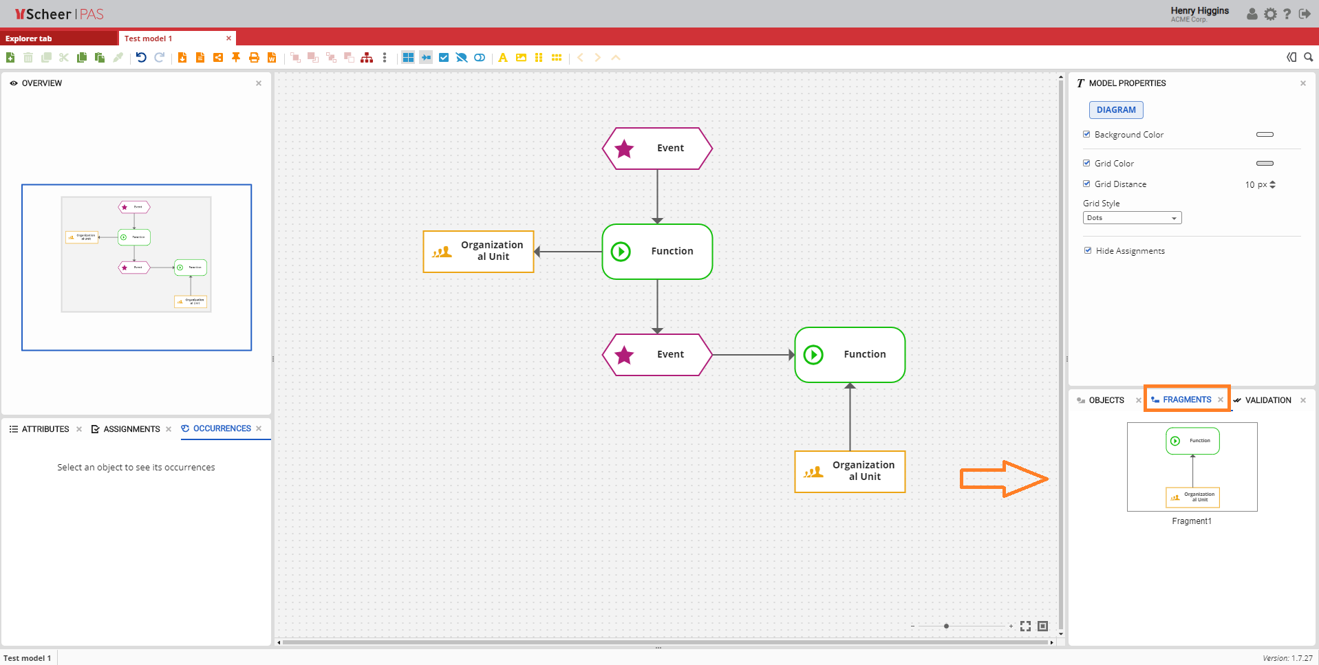 The Fragments panel gives you an option to drag&drop fragments that are currently available for the type of a model that you selected. They consist of one or more selected objects created as a fragment.