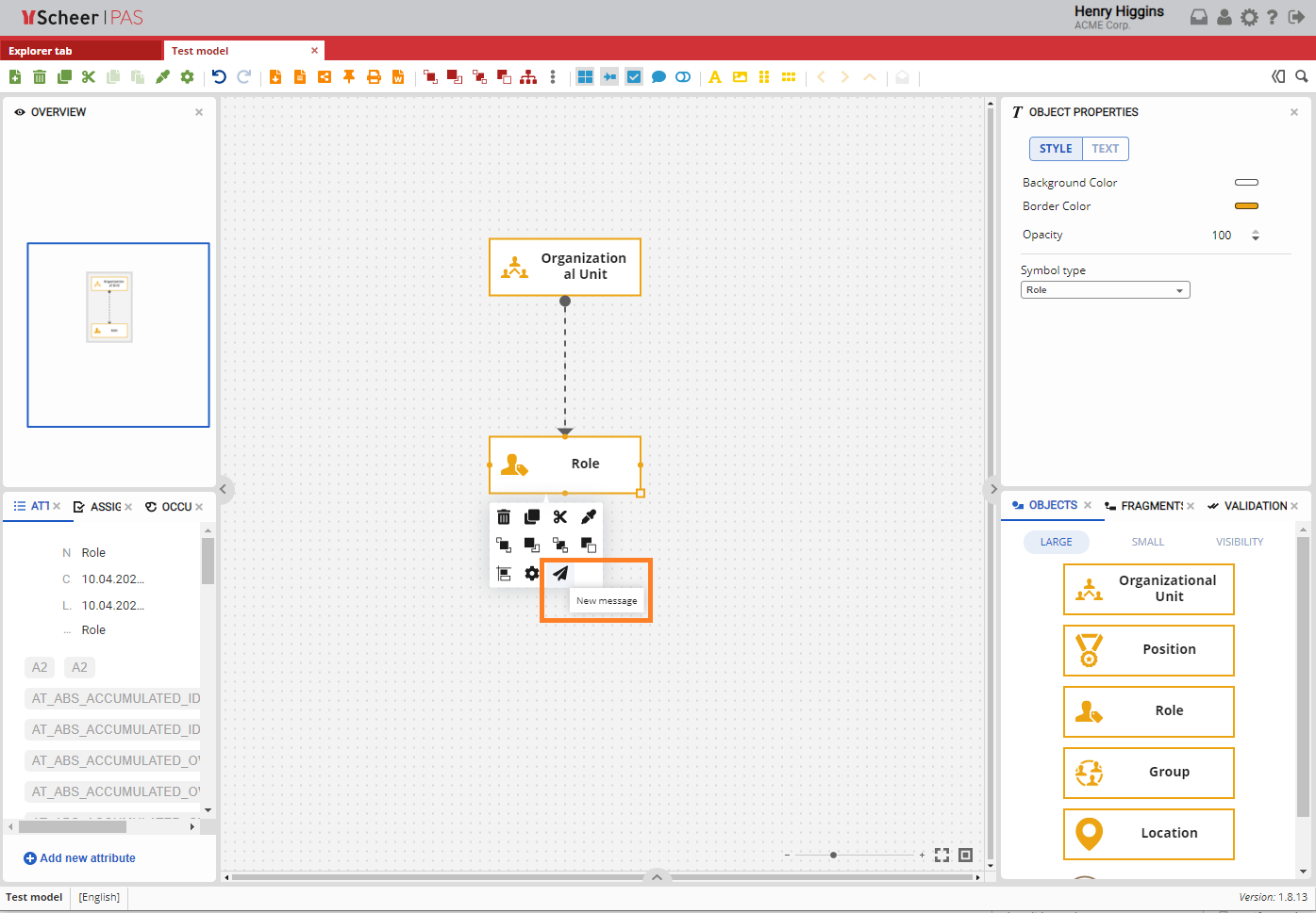 If you want to send a message from an object, right click on the object you want to sent a message from and choose New message.
