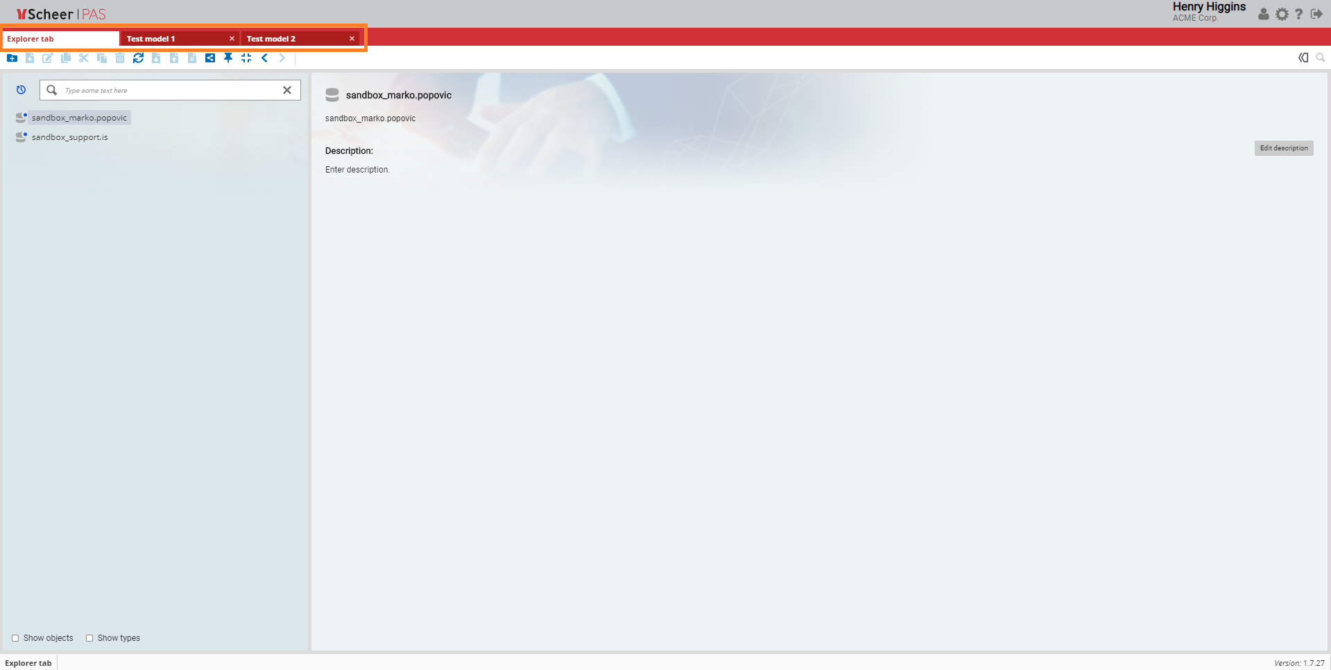 The navigation bar is used for navigating through different tabs, such as Explorer Tab, Administration and Messages tab or model tab. It allows you to keep several models opened at the same time.