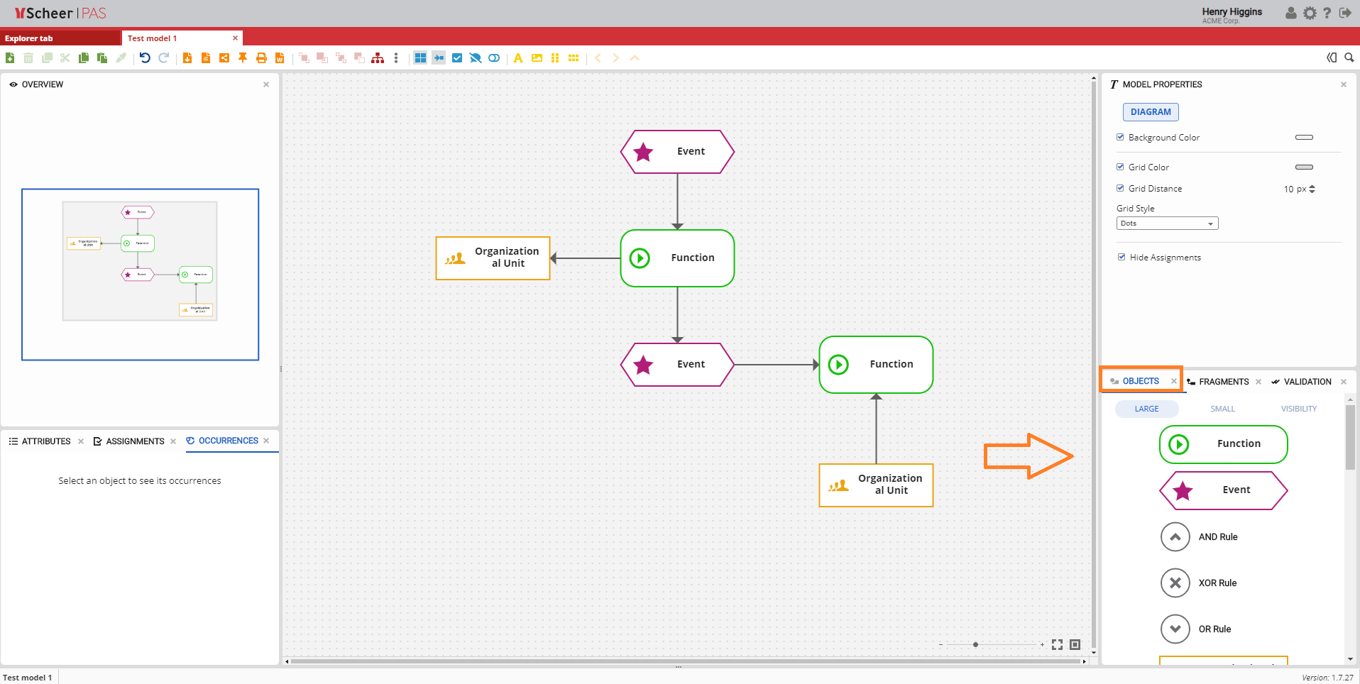The Objects panel is by default located in the lower-right corner of the screen, along with the Fragments, Validation and Compare Model panels.