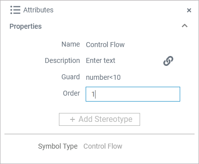 Select the control flow you want to add an order to from the activity diagram and open the Attributes panel: