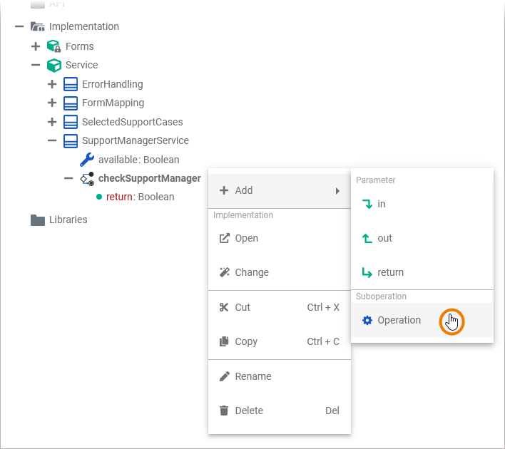 Via the context menu of an operation, you can add suboperations to it. Right-click on the operation to which you want to add a suboperation to, to open its context menu. Select Add Operation from section Suboperation.