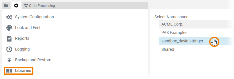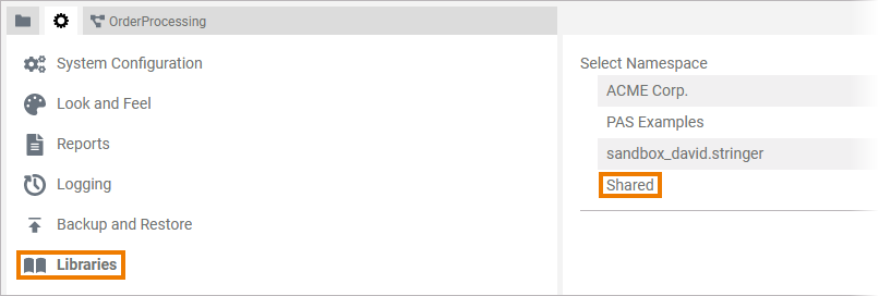 In addition to the individual profiles that can be assigned to a user, each Designer user also has access to a shared namespace. Namespace Shared is displayed by default in the library administration. Upload a library to namespace Shared to make it available to everyone working on your system: