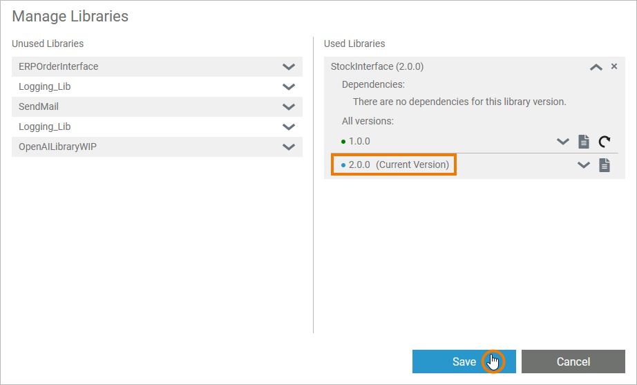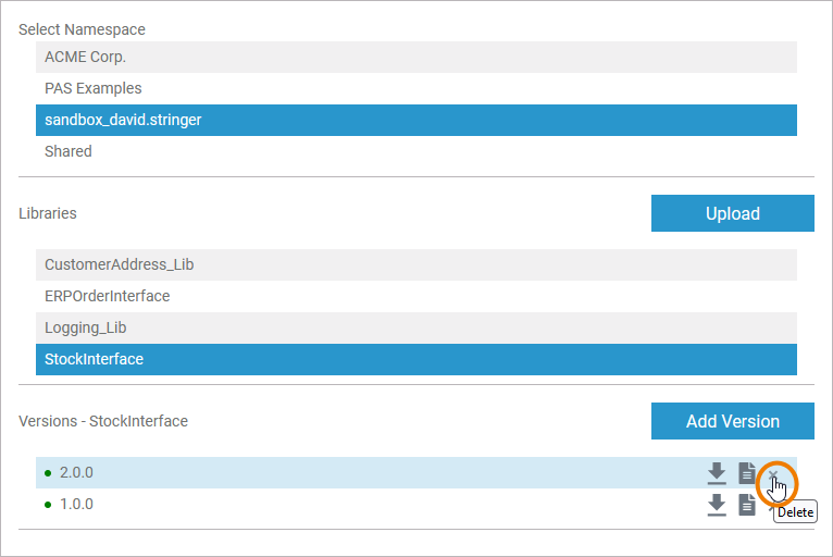 If you delete a library version in the administration that is still in use, the implementation of all affected services may become invalid.