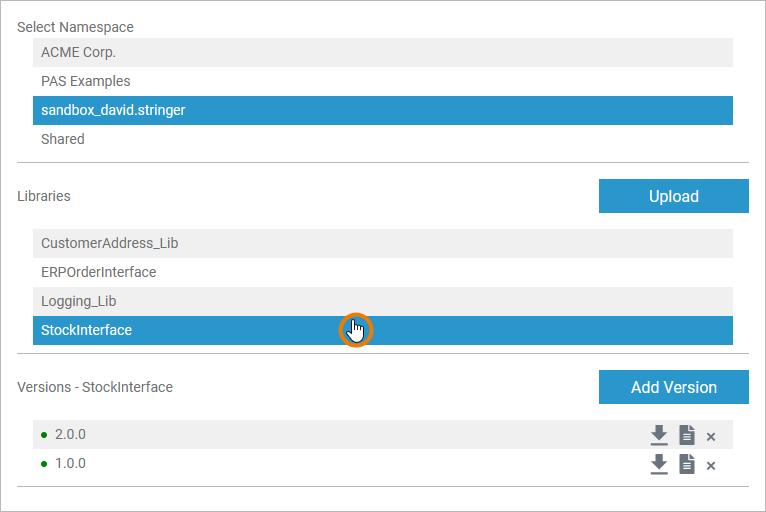 All uploaded libraries of the selected namespace are listed in section Libraries: