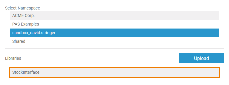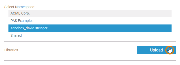 The selected namespace is highlighted in blue and section Libraries is displayed. You are now able to upload library files to the selected namespace. To start the upload process, click Upload:
