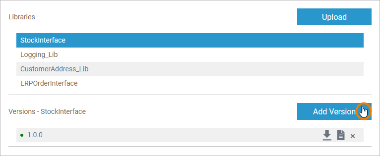 The Designer allows you to upload several versions of a library. Select a library in the list to display section Versions where all available versions of this library are displayed: