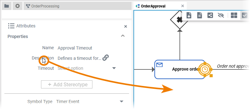 It is possible to display the attributes of a BPMN element on the diagram pane. Click on the name of the desired attribute and move it to the diagram pane using drag & drop: