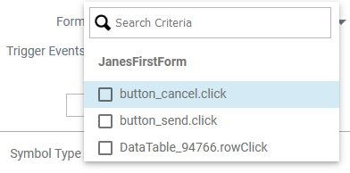 Trigger Events | ![]() | Attribute Trigger Events is only available for the elements Message Event and Plain Event (as a boundary event) and for the element User Task. Use the selection list to assign which event triggers the default process flow of a BPMN process. The pop-up also contains a filter that you can use to search for a specific event: ![]() |