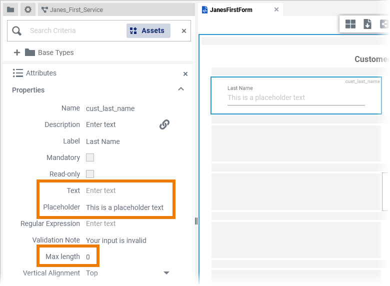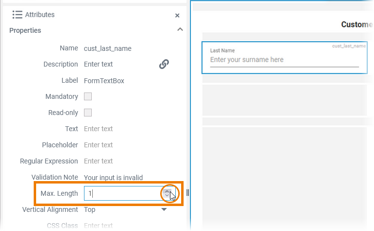 The attribute Max. Length allows you to limit the number of characters that can be entered into the input field. The default value is 0. If the value is empty or 0, the length of the text that can be entered into the input field has no limit: