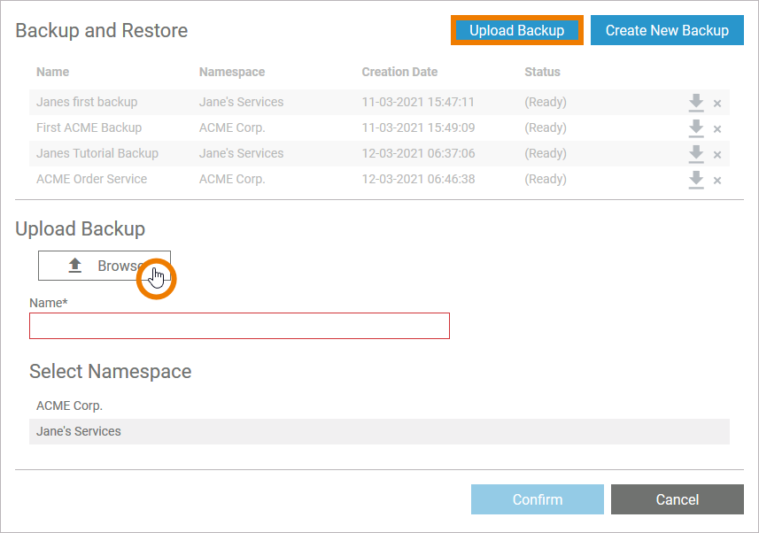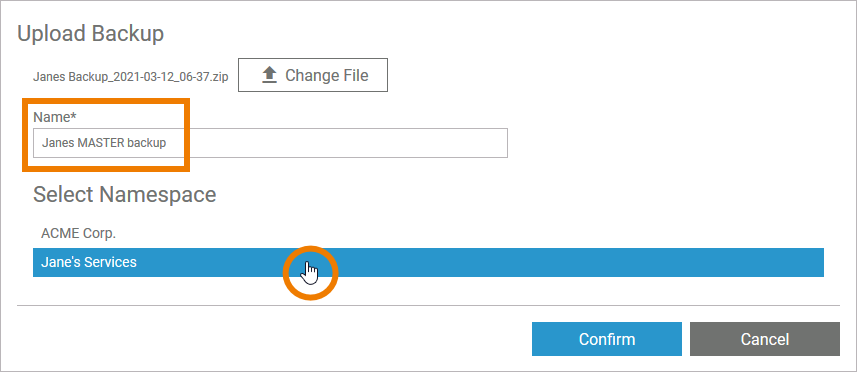 Change the contents of the Name field of you want to rename the backup before uploading it. Option Confirm is only enabled after you have selected the namespace to which the file is to be uploaded: