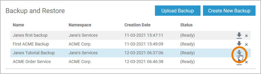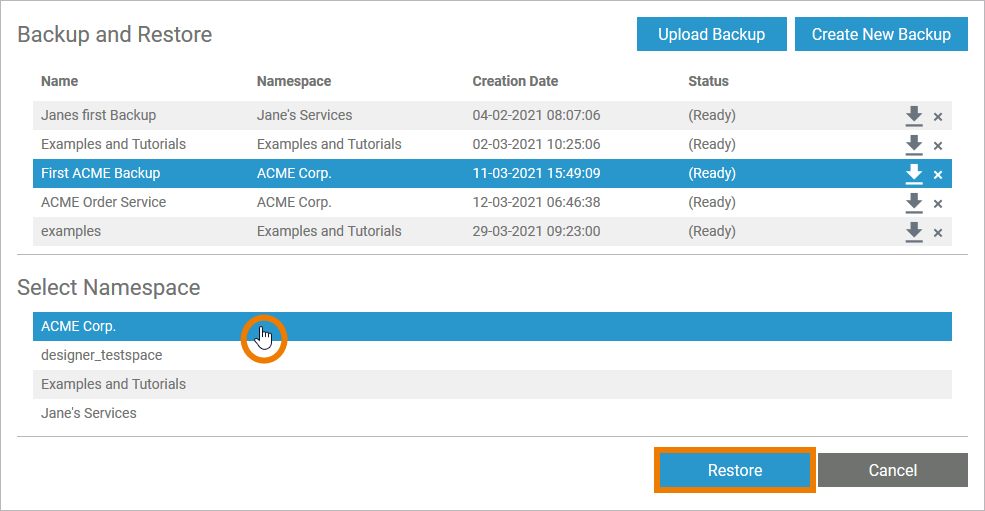 Upload Backup: Use this option if you want to restore an earlier version of a namespace.
