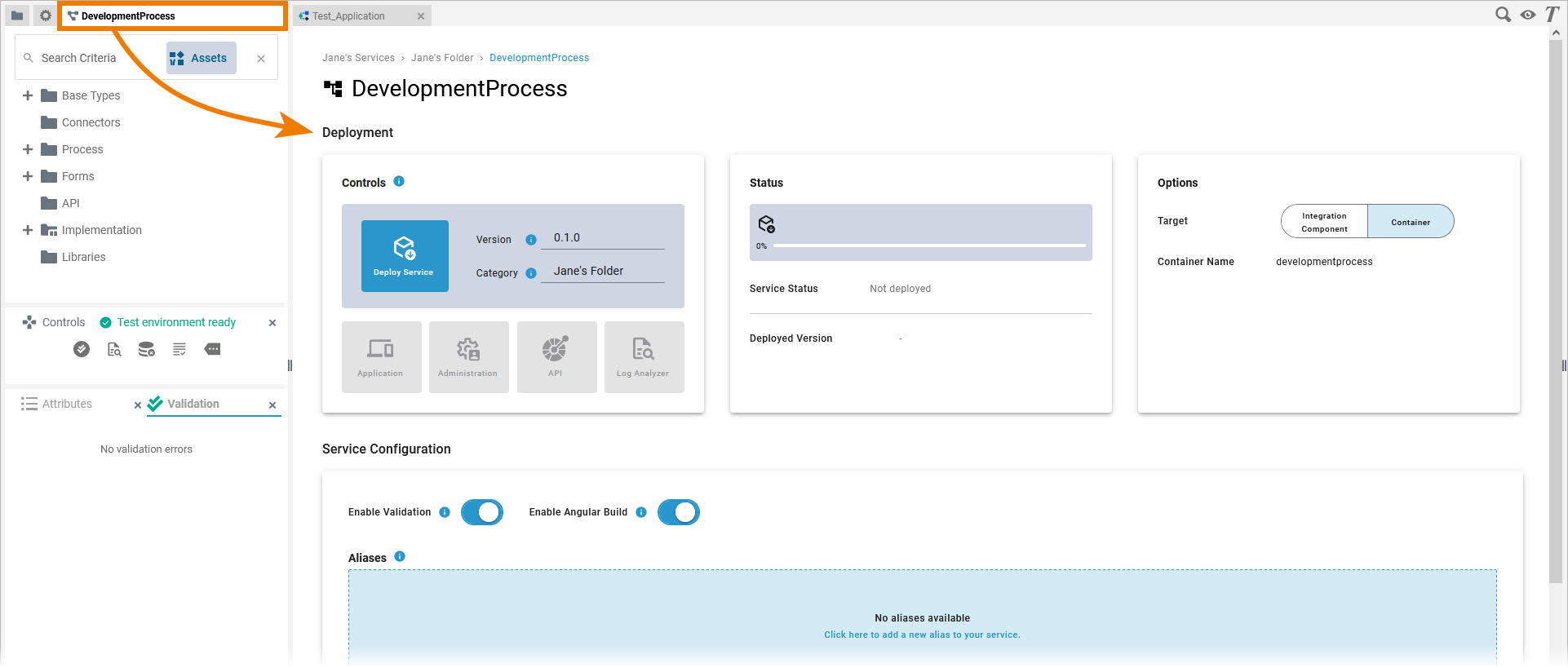 Especially in fusion teams, developers want to make a finished feature or an intermediate state of a service available to other team members for testing while they continue to work on the same service. This is easily possible in the Designer by using the test environment for developing (refer to Working with the Test Environment for details) and deploying to the test server only when necessary. You only need to deploy your service if you want to allow other team members to test new features or if you want to run regeression tests against your test server.