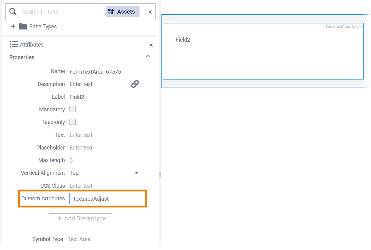 The attribute Custom Attributes has been added to all supported form elements in the Designer to enable the usage of Angular directives. Angular attribute directives are used to change the appearance or behavior of DOM elements and Angular components. Refer to the official Angular documentation for details on how to create an Angular attribute directive.