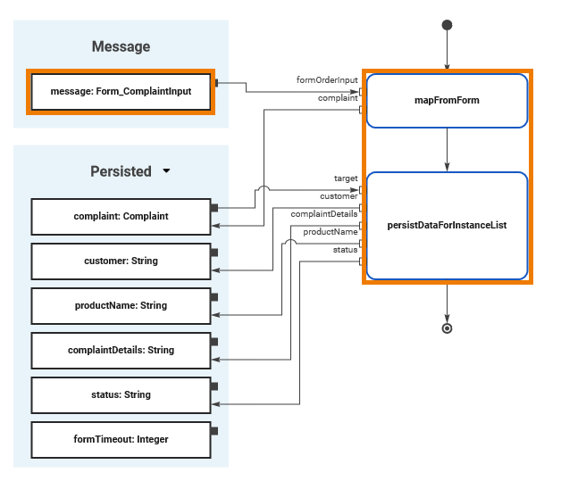 In the Instance_List_Example, the entered data is transferred from Form_ComplaintInput via the mapping operations mapFromForm and persistDataForInstanceList to the persisted variables: