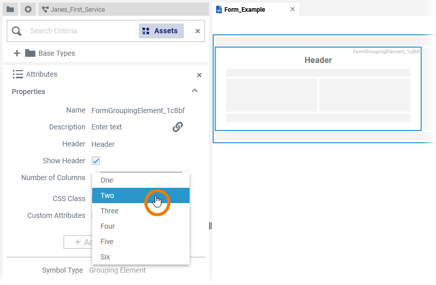 Grouping elements can be multi-column. Use the attribute Number of Columns to set the desired column number. Up to six columns are possible: